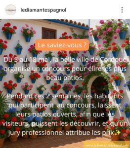 Pendant 2 semaines, les habitants qui participent au concours, laissent les portes de leurs patios ouvertes, les patios sont richement décorés et fleuris, les visiteurs peuvent y entrer gratuitement & un jury professionnel attribue les prix !! 🏆